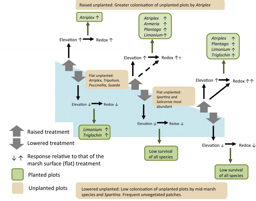 - We experimentally manipulated elevation by ±15 cm at locations that spanned the elevation ranges of three saltmarshes recently reactivated by managed coastal realignment. Experimental plots were initially cleared of any vegetation. Elevation and sediment redox potential were determined for each plot. We planted five perennial species (Armeria maritima, Atriplex portulacoides, Limonium vulgare, Plantago maritima and Triglochin maritima) in half of the plots, recording survival over 4 years, and monitored natural colonization of the other plots.