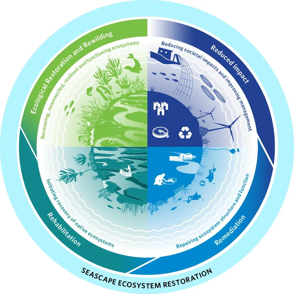 Temperate coastal marine ecosystems have undergone severe global loss and degradation. We provide a framework for considering ecological connectivity in marine systems and evidence for ecological connectivity across temperate coastal seascapes, developed through expert consensus and structured review. We demonstrate that ecosystem functioning and the delivery of ecosystem services require the existence of a healthy mosaic of coastal habitats, maintained by the exchanges of matter and energy between them. We advocate a seascape approach, that restores connectivity and optimal structure-function relationships, is crucial for successful ecosystem restoration. Consequently, we provide recommendations to deliver seascape restoration of coastal habitats to support the targets set by the 2021-30 UN Decades of Ocean Science and Ecosystem Restoration. Acknowledging the interconnected nature of coastal ecosystems has implications for policy. We identify opportunities and actions to support nature recovery and integrate policy frameworks across climate and biodiversity agendas to achieve international goals for planetary resilience.